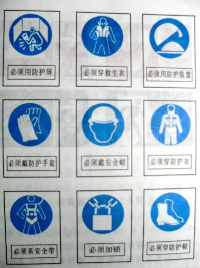 (3)指令標(biāo)志的含義是強(qiáng)制人們必須做出某種運(yùn)作或采用防范措施。其圖形和含義如下圖所示。(注明:圖形為白色,指令標(biāo)志色均為藍(lán)色。)