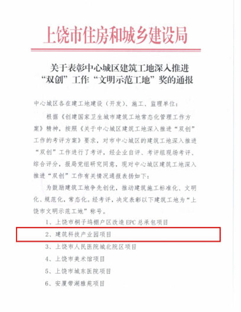 集團(tuán)投資承建上饒市建筑科技產(chǎn)業(yè)園項(xiàng)目獲評(píng)上饒市文明示范工地