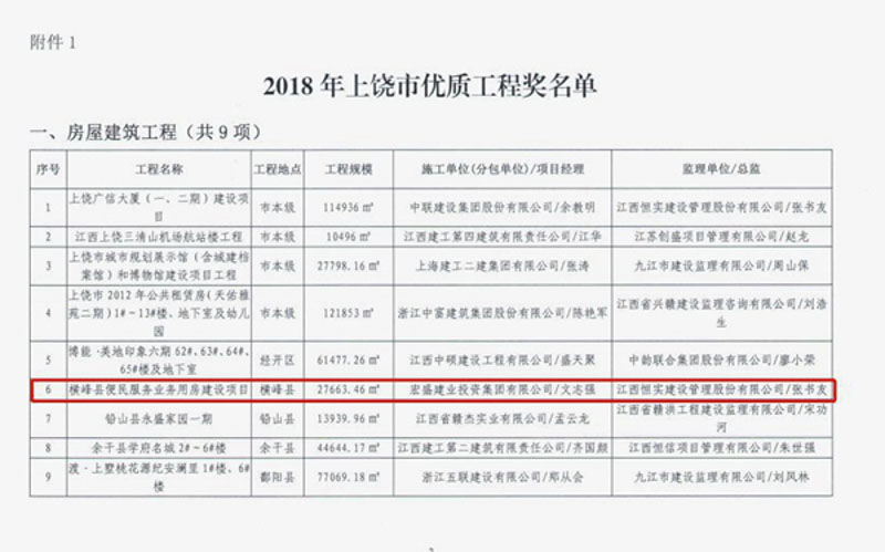集團承建項目橫峰縣便民服務(wù)業(yè)務(wù)用房項目獲評2018年度上饒市優(yōu)質(zhì)工程獎、2018年度上饒市建筑安全生產(chǎn)標準化示范工地獎;上饒建筑科技產(chǎn)業(yè)園總部經(jīng)濟園項目,萬年縣完全中學、六〇小學、智慧校園管理中心、第三幼兒園工程規(guī)劃EPC總承包項目,獲評2018年度上饒市建筑安全生產(chǎn)標準化示范工地獎。