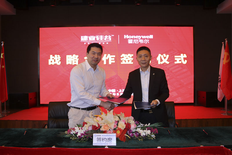 在宏盛建業(yè)上??偛浚晔⒔I(yè)投資集團董事長周金虎與霍尼韋爾建筑智能系統(tǒng)部中國區(qū)總經(jīng)理楊珂簽訂長期戰(zhàn)略合作協(xié)議。